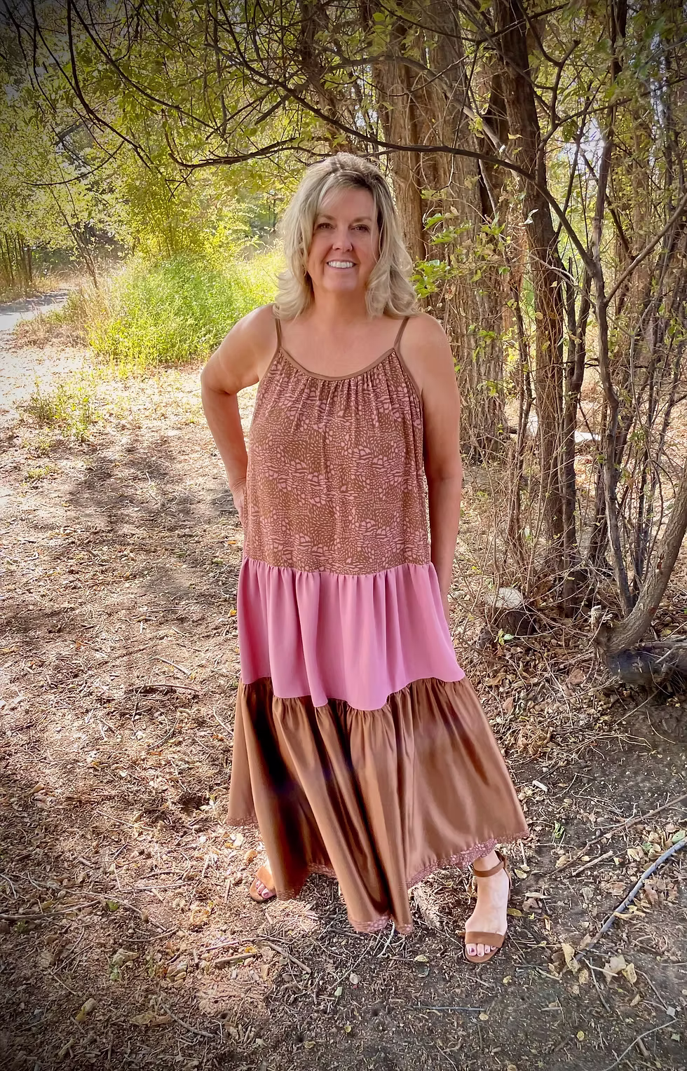I love the way the rust satin adds glam and allure to the dress which is why I chose to feature it in the largest section of the skirt. To tie the dress together I created the bias binding for the shoulder straps and the neckline from this rust satin as well. This is a more sturdy fabric which also gives the straps some structure as the tiers of the dress can get quite heavy and using a lighter weight bias may have eventually stretched the straps. I love the shine that it adds to the dress.