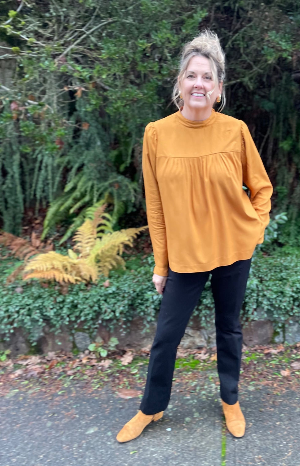 My Sew Indulgent Sewing Box was so nicely curated. It comes complete with the Regalia blouse pattern from Sew House Seven, your choice of fabric, netting for the pouf sleeve cap, thread, and a needle. There were three lovely fabrics to choose from. I chose the Ochre Dotted Viscose. This fabric is wonderful; it has a glorious drape and is incredibly soft. It was nice to have two different fabric options that were both within my Calm Autumn colour palette. As I wanted a fabric that could be dressed up or down, I chose the ochre viscose, the dot pattern has a nice sheen to it which will be perfect for the holidays.