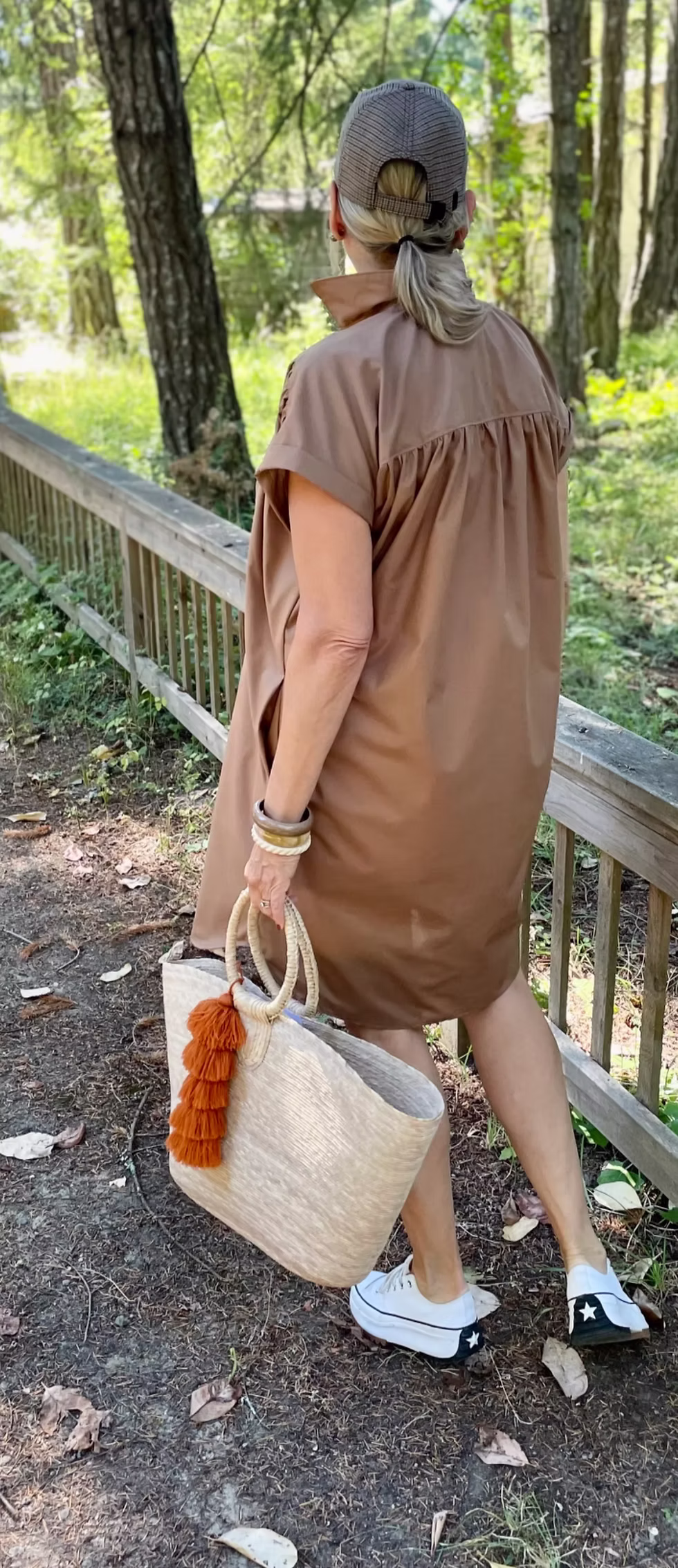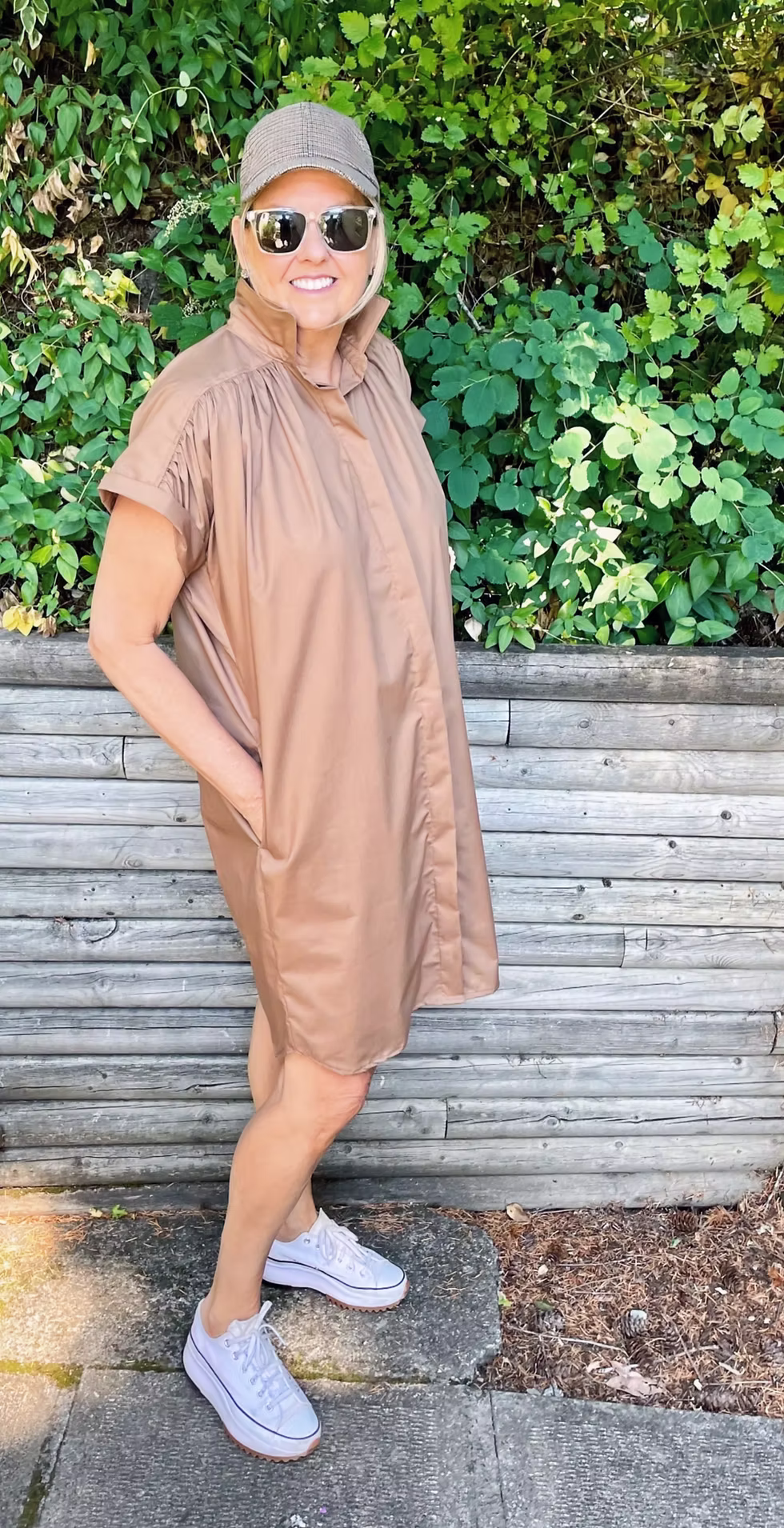 Augusta is a great addition to your summer wardrobe. It is easy to wear and can be styled in so many ways. I choose this lovely crisp cotton poplin from Minerva for my dress. It is a core range light weight 100% cotton poplin, perfect for summer dress making. It is an OEKO-TEX that comes in over 35 different colours I love this neutral colour. It makes a great foundation piece for countless styling options. I'm wearing it here with sneakers and a baseball hat, a perfect combination for running errands. It will look fantastic with sandals or flat slides as well for a dinner out. I think that it this dress will transition beautifully into fall worn with tights and boots.