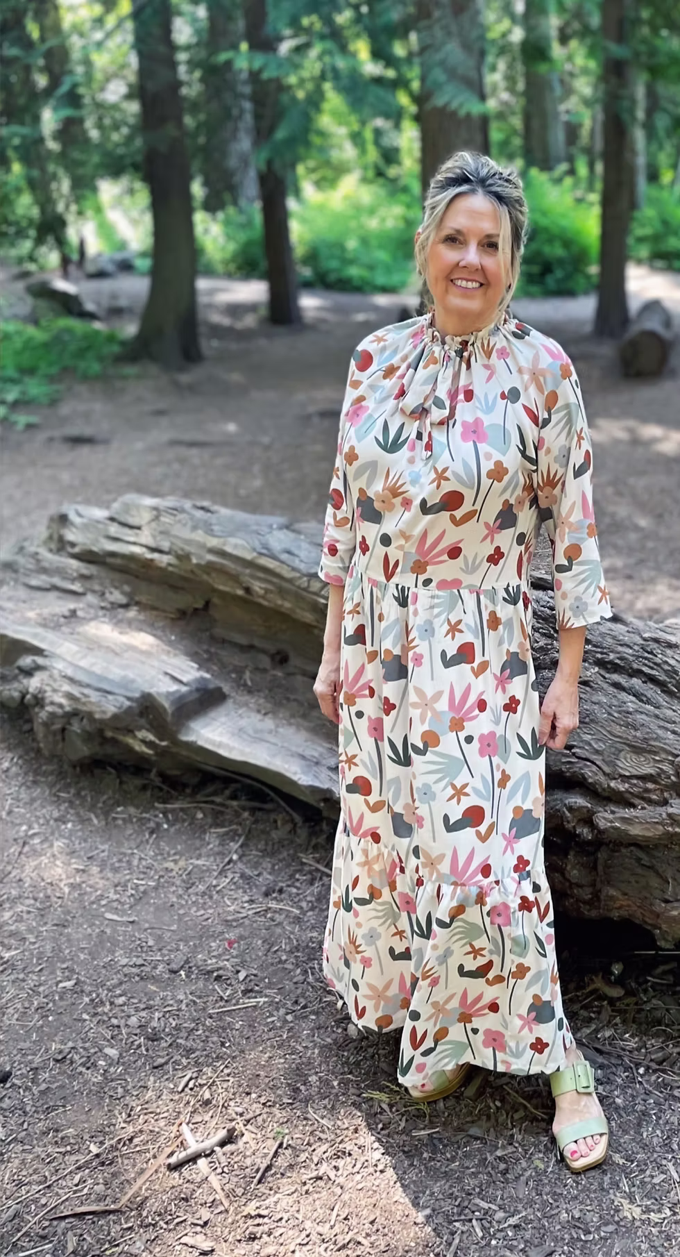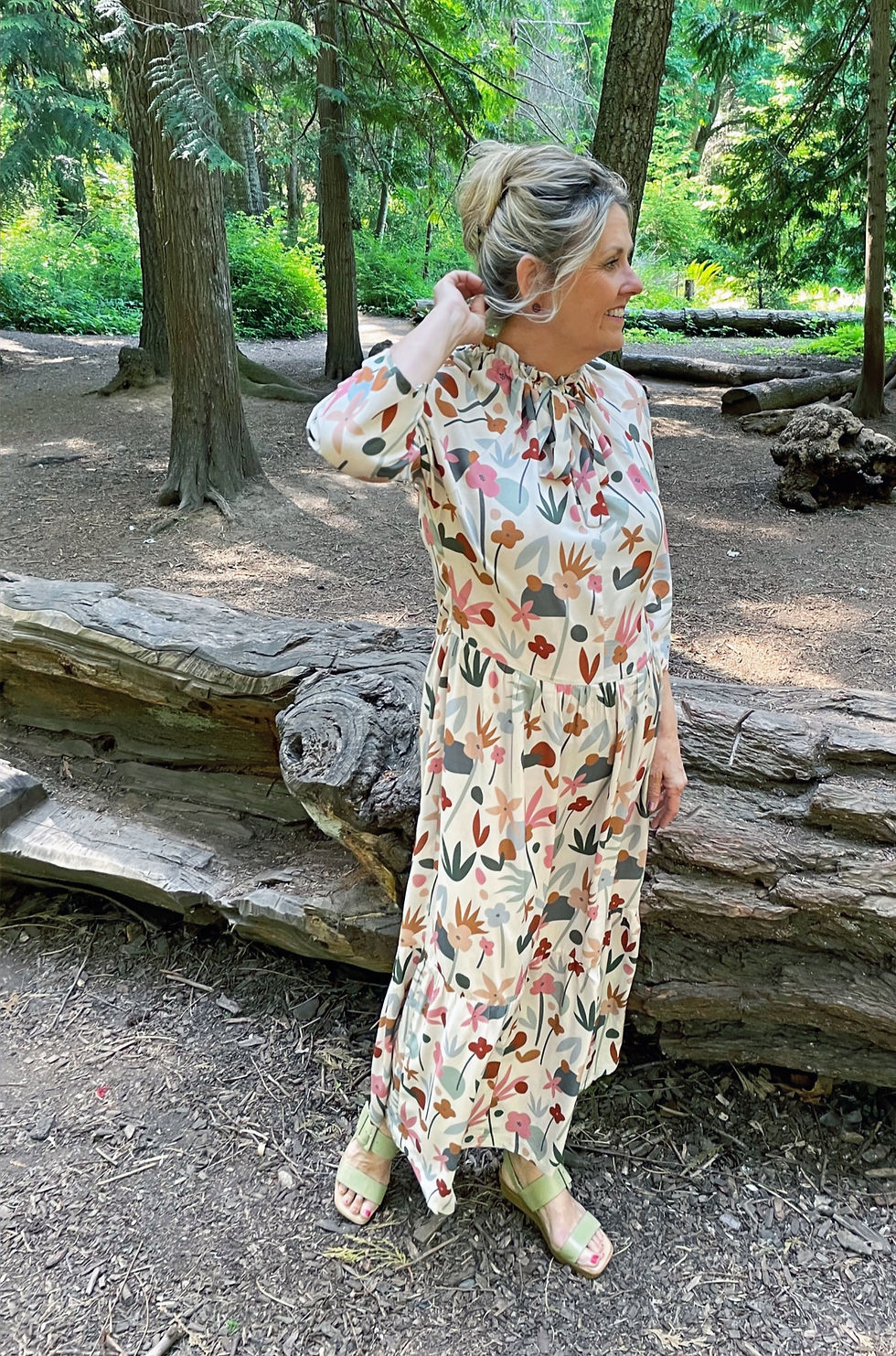 I adore the Serene Meadow viscose challis. The colours are muted and subtle making this a versatile dress to wear to any occasion; it feels sophisticated and fun. The drape of the fabric is perfect. The multiple tiers of the Wilder Gown hang beautifully, giving the dress that perfect flow so you feel elegant and sophisticated without the dress feeling heavily. This is the second maxi dress I have made with these exclusive fabrics from Minerva. You can see my other dress, the Fibre Mood Josephine, made with the Herbal Halo viscose callis here.